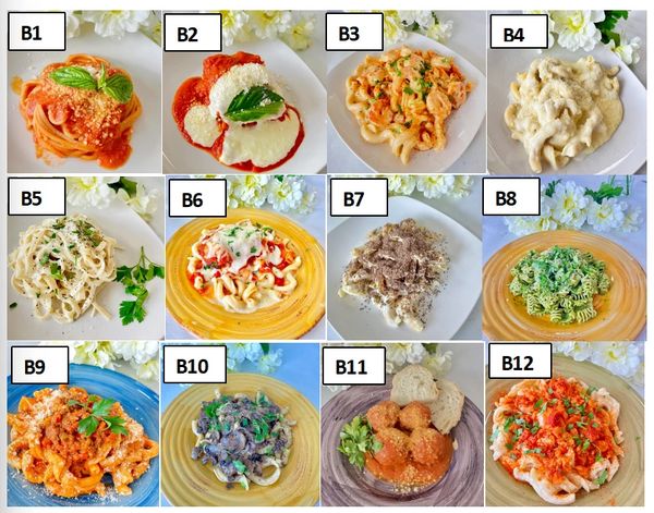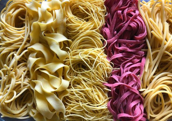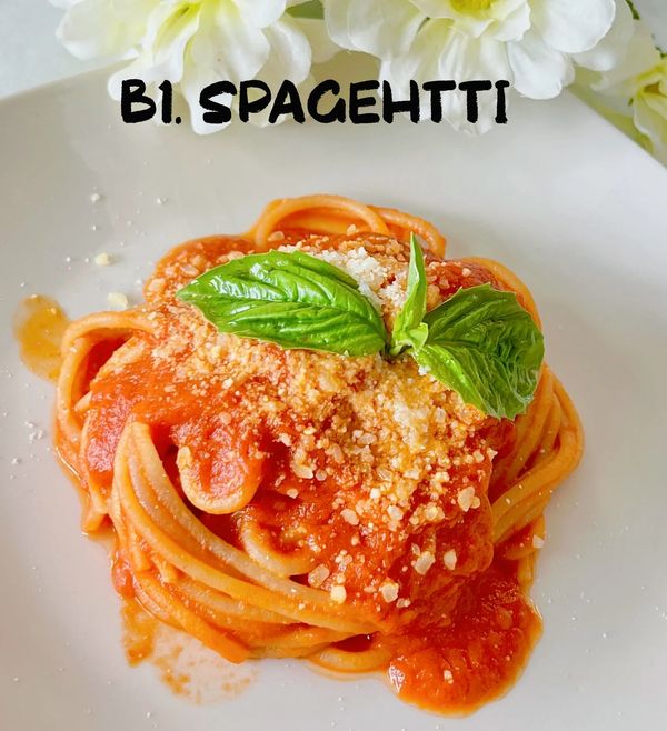 Handmade Italian noodles in vegan tomato & basil sauce, topped with parmesan cheese.