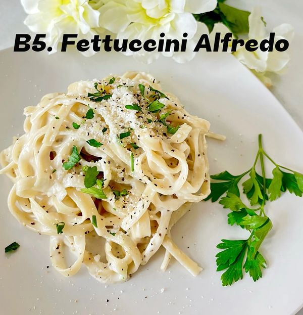 Silky fettuccine tossed in creamy Alfredo sauce with Parmesan and butter, finished with fresh herbs and chicken.