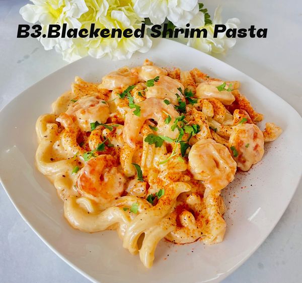 Creamy sauce pasta with white wine, blackened shrimp, and Cajun spices.