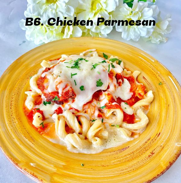 Crispy breaded chicken topped with rich marinara sauce and melted mozzarella, served over creamy pasta.