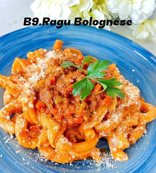 Fresh pasta with slow-cooked beef in a hearty tomato ragù, topped with aged Parmesan, carrot, celery,onion.