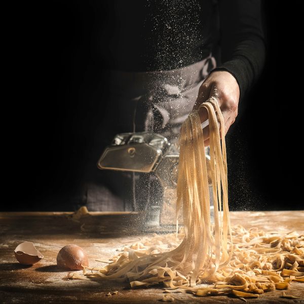 Handmade Italian noodles in vegan tomato & basil sauce, topped with parmesan cheese.